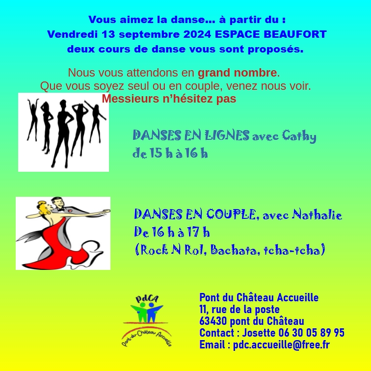 COURS DE DANSE 2024/2025 COURS DE DANSE 2024/2025 11/06/2023 Pont-du-Chateau-Accueille Les inscriptions sont ouvertes Vous aimez la danse, n’hésitez pas à nous contacter, nous sommes à votre disposition pour tout renseignement complémentaire.